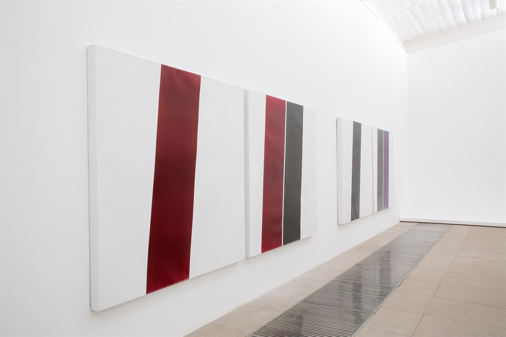 From image to image processing, there is not only the subversion and fragmentation of past aesthetic tastes and styles, but also the attempt of collage and construction, resulting in a new visual tension. This tension comes from the rebellion and challenge to cognitive styles and narrative rules formed by art works and art history. Gu Xiaoping questions this kind of illogical and unreasonable absurdity and highlights its absurd ending, which is the dismantlement of the original creative consciousness and expression in the relationship of “mutual image”, or a kind of counterquestion ‘makes the absurdity absurd’. Thus, he deconstructs the boundaries of the so-called artistic concept stipulated in the history of painting. Compared to the artist’s ancient exhibition, there are advancements. He uses an intuitive visual tension to transform this external body plucking action into an image. Here, painting has become a measure, a patient and meticulous deliberation. For instance, the square painting in this exhibition, its length of 176cm is the artist’s height and the length of two ribbons running through the image is his shoulder width. He uses more methods of measuring, marking and cutting the canvas to continue strengthening this standardized and complex language, embodying an absurd inertia in a painting that is not like painting, leaving his art traces on various medium.