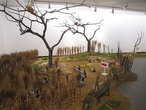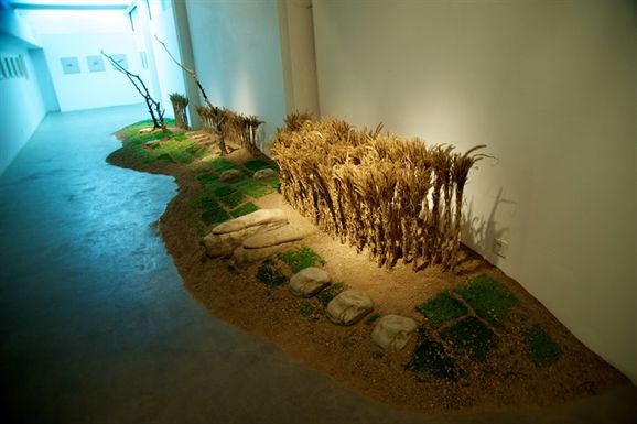 His newest work " The most beautiful and correct nature", use the realistic method to create an ultima blueprint of the fake nature, homogeny sand, square grass block, random but symmetry fences, manual-facture long grass, simulated trees and tree trunks, birds, ducks are all created and interfered and fixed manually with a sense order. The artist rip out the individual interest in his works, and tries to create an unnatural figure by using the scientific methods of duplication, and arrangement.